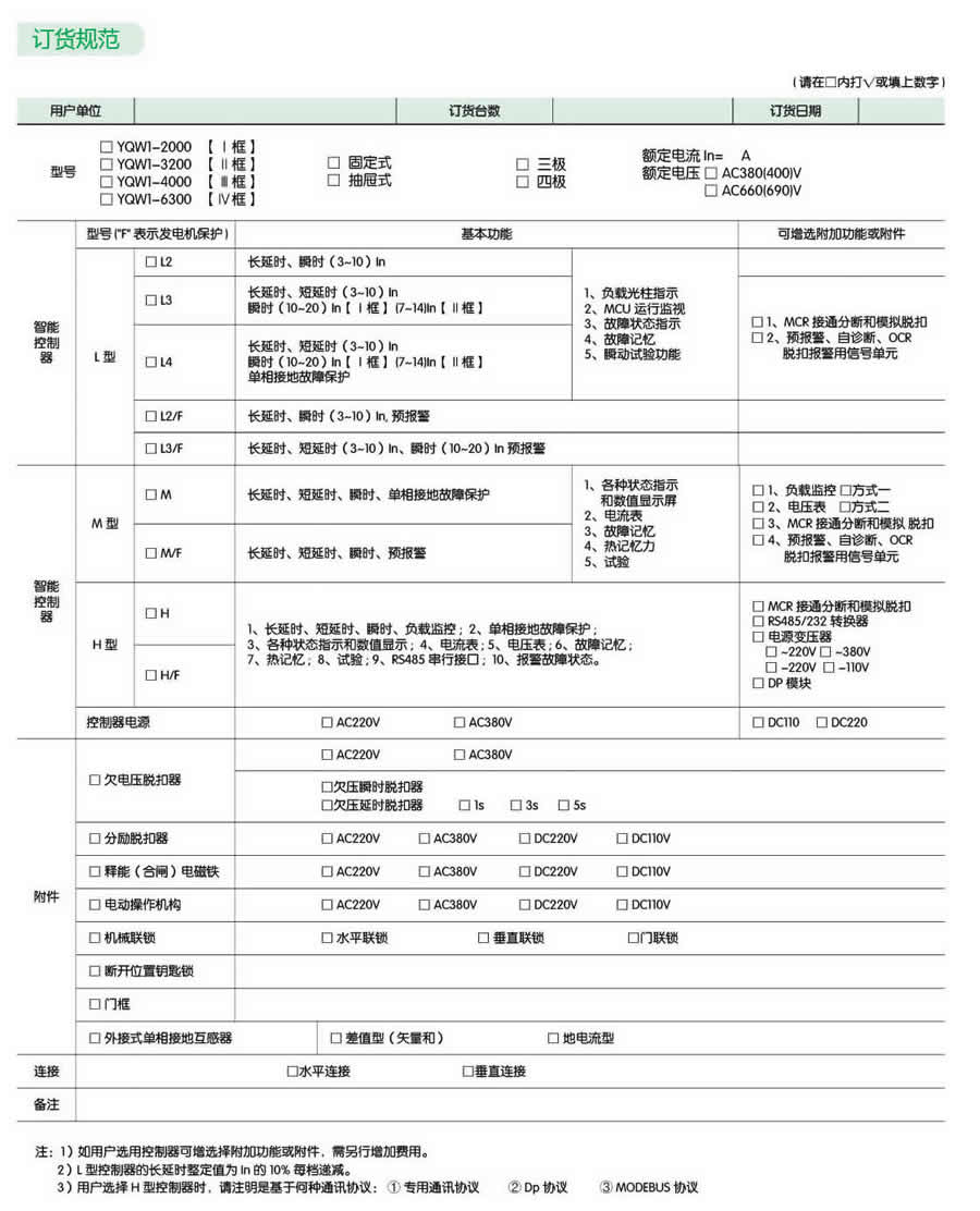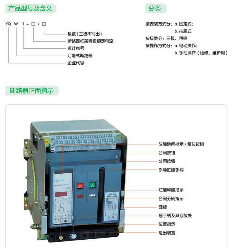 ● YQW1 系列智能型萬能式斷路器用于控制和保護低壓配電網絡,一般安裝在低壓配電柜中作主開關起總保護作用。